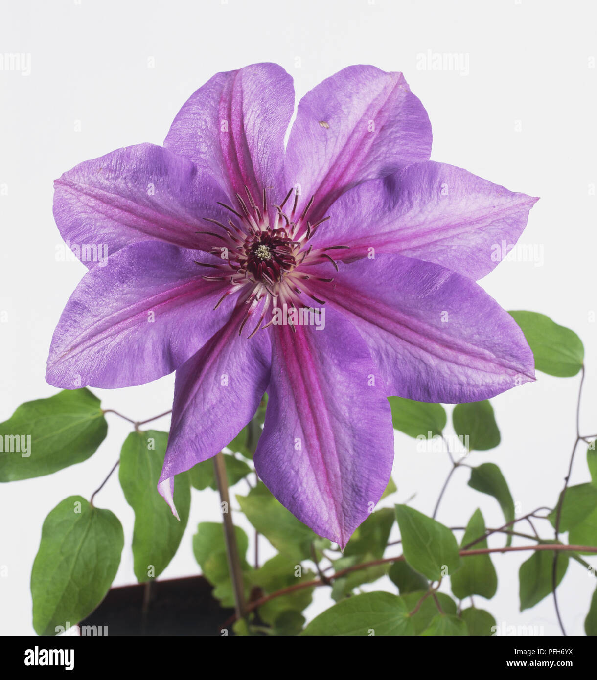 Flowers are single pale pinkish-purple with a dark pink central stripe and dark red stamens. Below are common attributes associated to Candy Stripe Clematis.